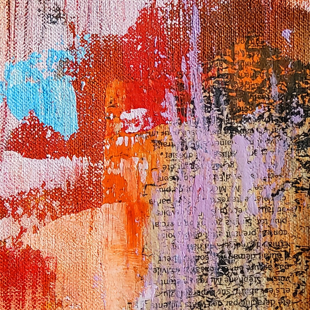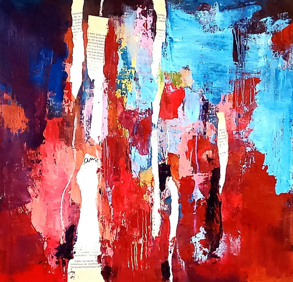 À partir d’un fond coloré, je place des découpages, morceaux de papier déchirés pour ensuite les intégrer.