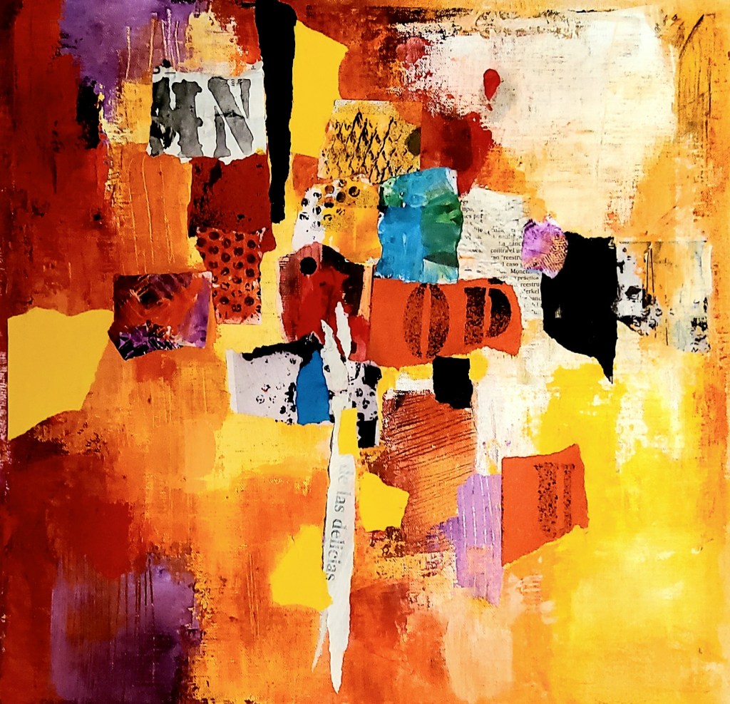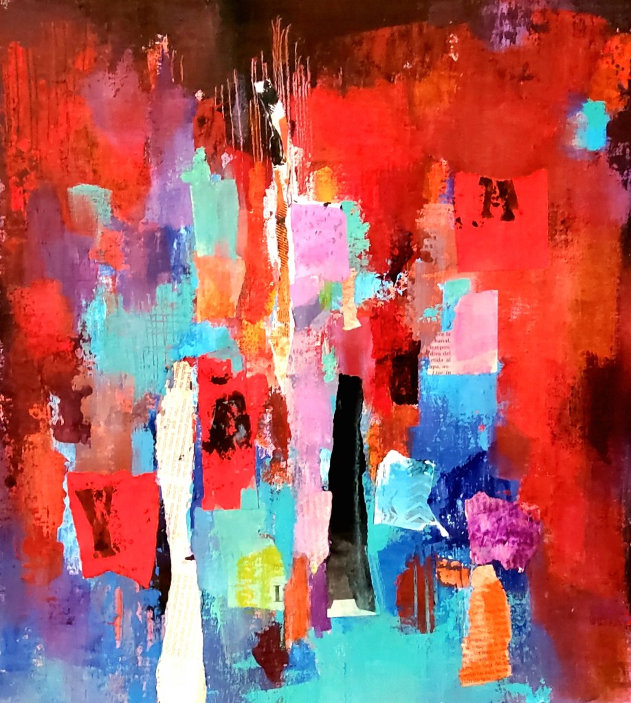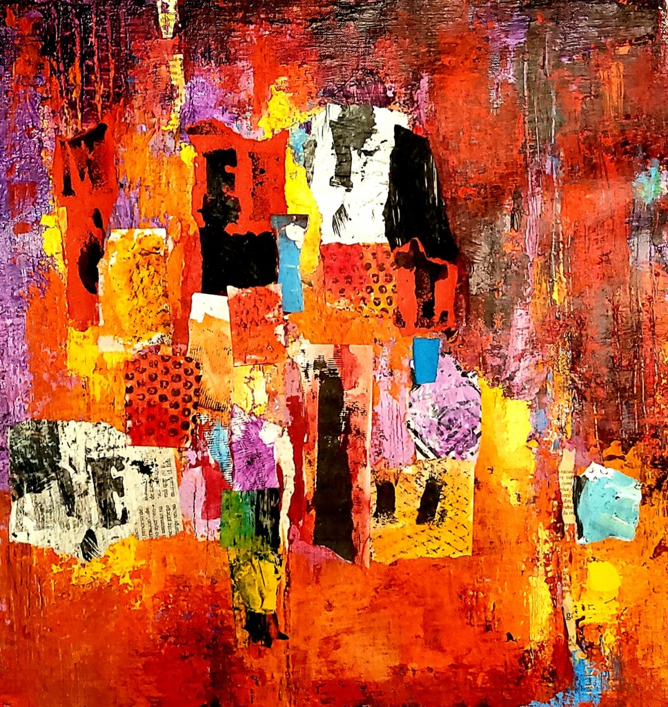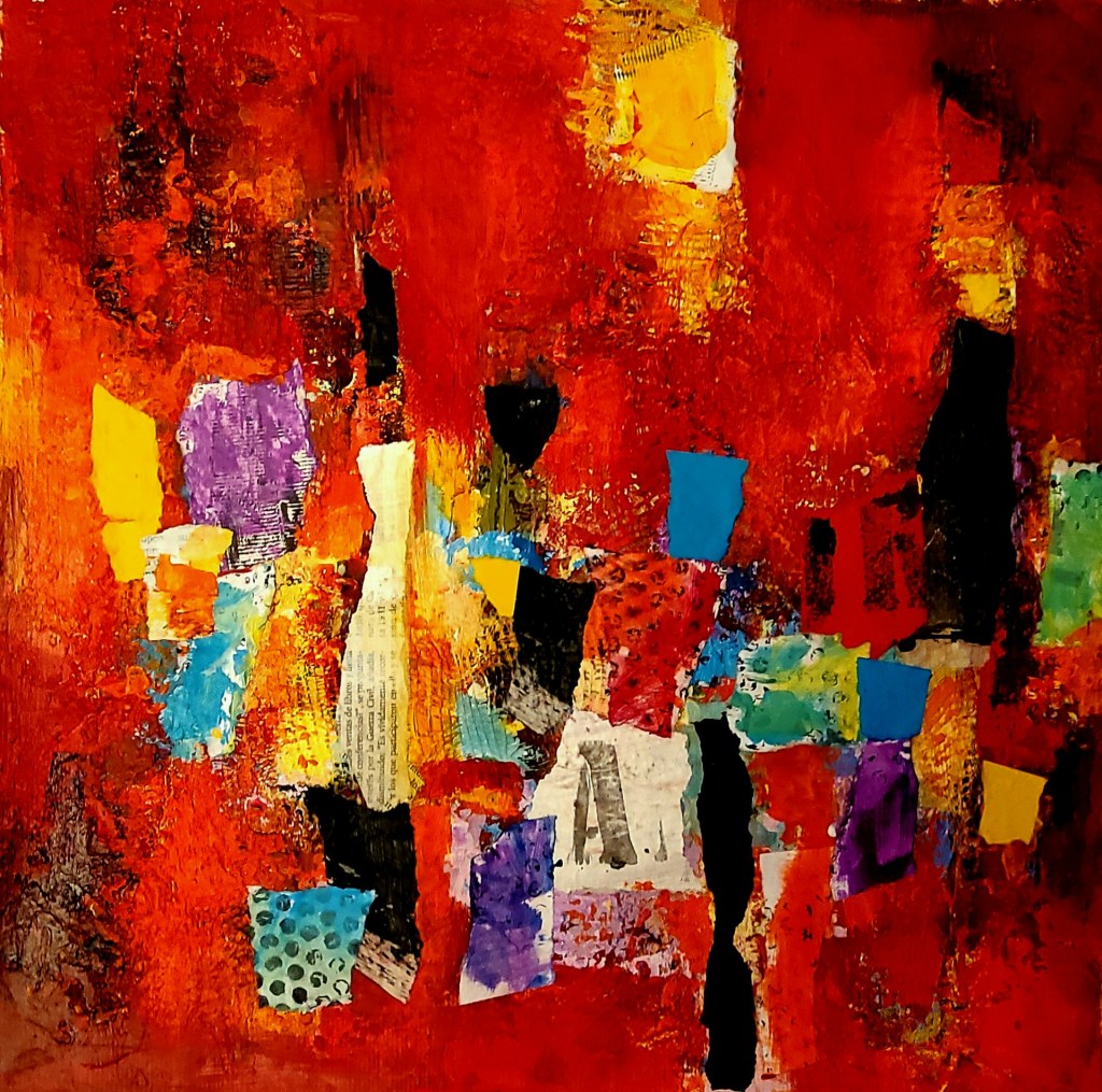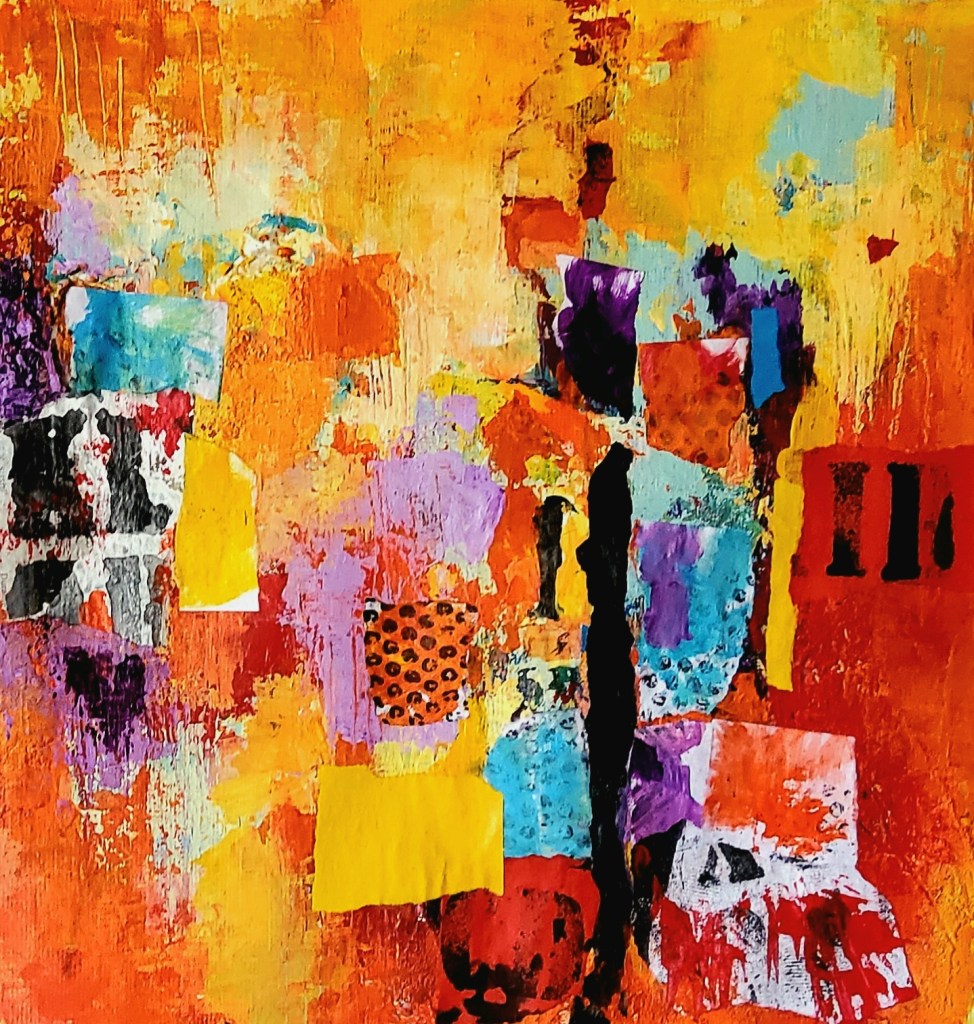 Etude de la couleur et des formes; créations réalisées en atelier nomade que je pose au gré de mes voyages; ces petits formats à l’acrylique et collage s’adaptent parfaitement à ce style. Je prépare les collages sur différents types de papiers, blanc, couleurs, emballage, papier journal… des infos en bas de la page.